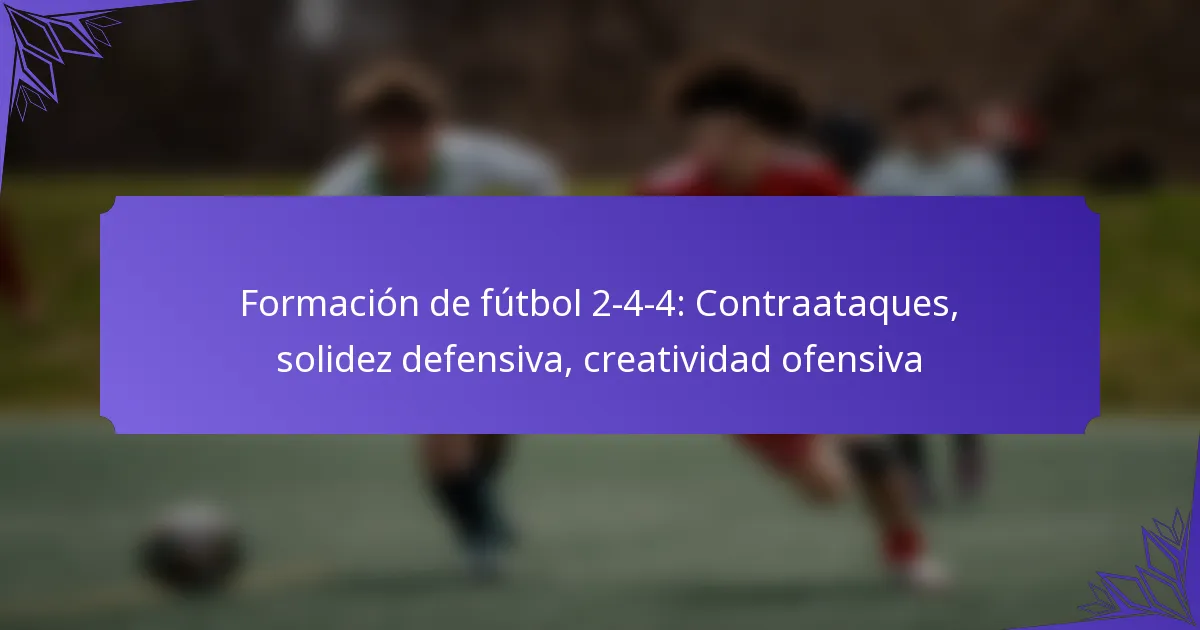 La formación de fútbol 2-4-4 es un esquema táctico dinámico que combina dos defensores, cuatro centrocampistas y cuatro delanteros, priorizando la creatividad ofensiva mientras asegura solidez defensiva. Esta formación facilita rápidos contraataques, permitiendo a los equipos capitalizar las vulnerabilidades de los oponentes y transitar rápidamente de la defensa al ataque. Al aprovechar la velocidad y la colocación estratégica de los jugadores, la formación 2-4-4 crea numerosas oportunidades de gol mientras mantiene una estructura defensiva robusta.